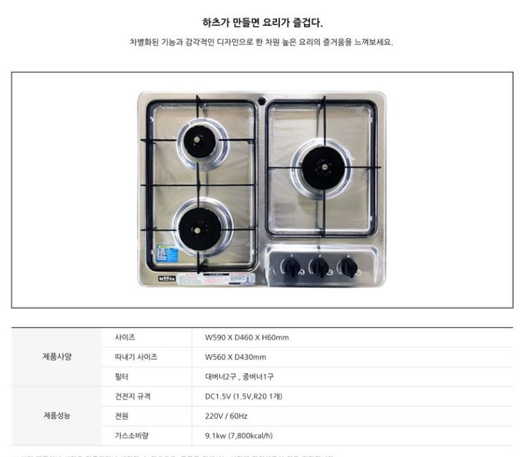하츠는 중저가 가성비 주방 브랜드로 익히 알려진 제품입니다. 메이저 가스레인지 회사인 린나이나 SK 매직에 비해 가격이 낮은 장점이 있습니다. 대버너 1구, 중 버너 2 구로 3구쿡탑을 완성했고, 빌트인 형태입니다. 싱크대 상판 따내기 사이즈는 560*430으로 사이즈는 잘 참조하셔야 합니다.