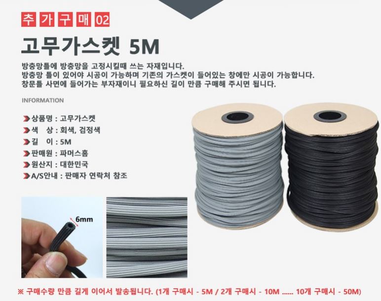 고무가스켓은 방충망을 틀에 고정시키는 역할을 합니다. 방충망과 틀사이의 빈공간에 고무가스켓을 y형밀대로 밀어 넣어서 고정시키는 방식입니다. 그래서 셀프 방충망 교체를 할 때, 고무가스켓은 필수적으로 필요하니 부자재를 선택하여 꼭 주문을 하셔야 합니다.
